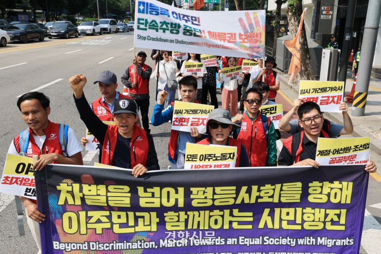 이날 집회에 참석한 아위씨(37)는 2009년 캄보디아에서 귀화했다. 그는 “여야 상관없이 이주민 정책을 살펴봤는데 진짜 투표할 사람이 없다”며 씁쓸하게 웃었다. 방글라데시 출신으로 2009년 귀화한 섹 알 마문 씨(51)는 “대한민국 인구의 5%가 이주민이다. 투표권이 없다는 이유로 정책에서 배제된다면, 투표 못 하는 어린아이는 국민이 아닌가”라고 물었다. 그는 “이주민 없이 한국 사회가 돌아가지 않는다는 사실을 알면서도, 막상 권리 보장을 외치는 목소리엔 귀를 닫는다”고 했다.