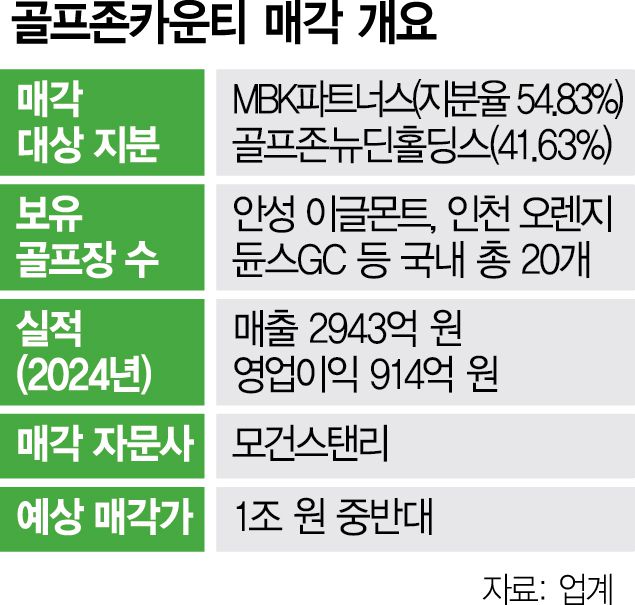 1일 투자은행(IB)업계에 따르면 MBK는 최근 자문사인 모건스탠리를 통해 국내외 기업 및 사모펀드 운용사에 골프존카운티에 대한 투자설명서(티저레터)를 배포했다. 이전 매각 시도 당시 2조 원대였던 희망 매각가는 1조 원 중반대로 하향 조정된 것으로 알려졌다. 현재 골프 산업에 투자 경험이 있는 국내의 한 사모펀드(PE) 운용사가 인수를 검토 중이다. 매각대상은 지분 100%로 골프존카운티는 MBK파트너스가 설립한 특수목적법인(SPC) 한국골프인프라투자가 보통주 54.83%, 전환우선주 3.54%를 들고 있다. 이어 골프존뉴딘홀딩스가 41.63%를 보유하고 있다.