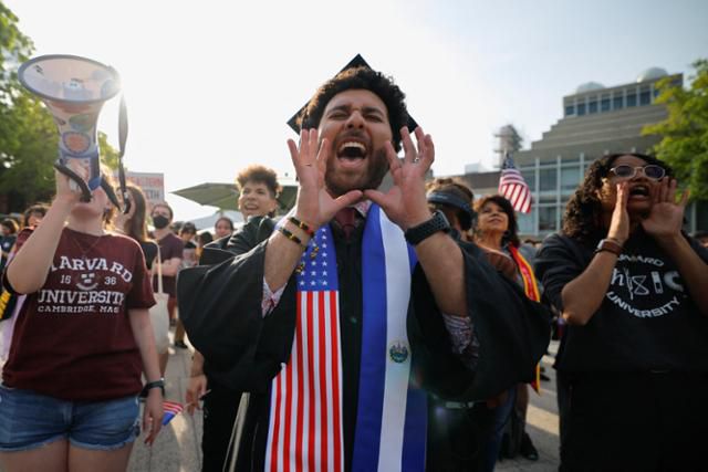 미국과 엘살바도르 국기로 만든 스톨을 걸친 사람이 지난달 27일 매사추세츠주(州) 케임브리지에 있는 하버드대에서 국제학생들과 연대하는 시위를 벌이고 있다. 케임브리지=로이터 연합뉴스 |