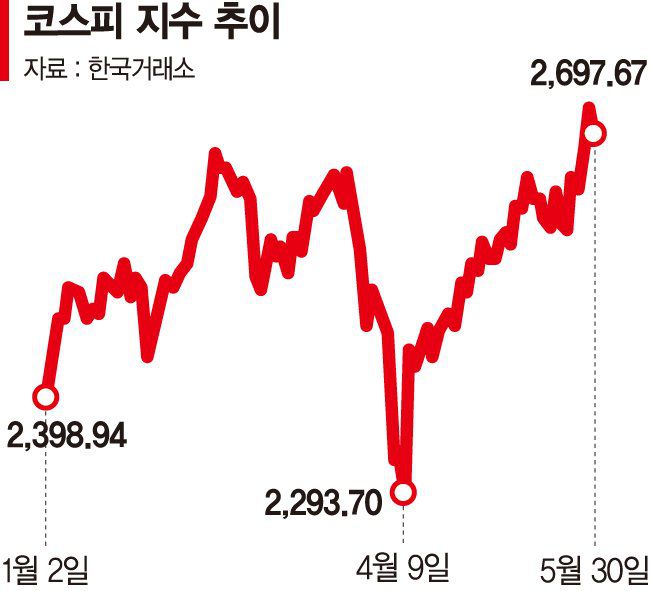 삼성증권 양일우 수석연구원은 "6월은 전강후약이 기본 시나리오지만, 관세 정책 등 불확실성 해소 시 오히려 하반기에 반등 흐름이 나올 수 있다"며 "글로벌 자금은 대기 중이지만 장기금리 부담, 일드갭(주식과 채권수익률의 격차)축소 등이 유동성 공급의 제약 요인"이라고 분석했다. 양 연구원은 또 "증권업종이나 일부 반도체 기업은 이익 모멘텀과 밸류에이션 측면 모두에서 성장하는 가치주로 접근할 필요가 있다"고 조언했다.