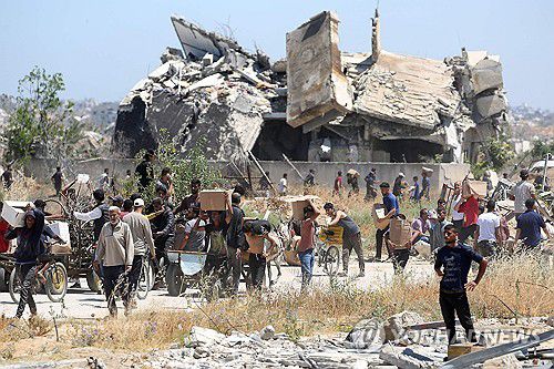 지난 29일(현지시간) GHF 배급소에서 구호품 받아 가는 가자지구 주민들.[AFP 연합뉴스 자료사진. 재판매 및 DB 금지]
