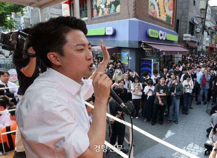 이준석 개혁신당 대선 후보가 지난달 29일 서울 성북구 고려대학교 인근에서 열린 유세에서 지지를 호소하고 있다. 성동훈 기자 |