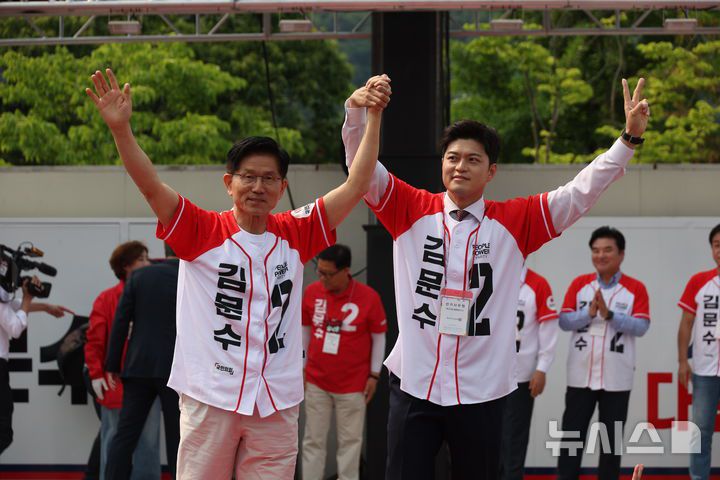 [가평=뉴시스] 고승민 기자 = 김문수 국민의힘 대선 후보가 30일 경기 가평 청평시계탑 광장에서 열린 유세에서 김용태(오른쪽) 국민의힘 비상대책위원장과 손을 맞잡고 지지를 호소하고 있다. 2025.05.30. kkssmm99@newsis.com |