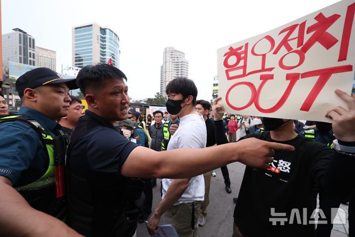 [서울=뉴시스] 조성봉 기자 = 1일 오후 서울 중구 서울역광장에서 열린 이준석 개혁신당 대선후보의 유세에서 시민들이 이 후보를 규탄하는 시위를 하자 경찰이 제지하고 있다.2025.06.01. suncho21@newsis.com