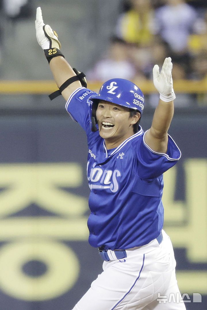 [서울=뉴시스] 최동준 기자 = 1일 서울 송파구 잠실야구장에서 열린 2025 KBO리그 삼성 라이온즈와 LG 트윈스의 경기, 8회초 2사 1루 상황 삼성 김태훈이 2점 홈런을 친 뒤 기뻐하고 있다. 2025.06.01. photocdj@newsis.com |