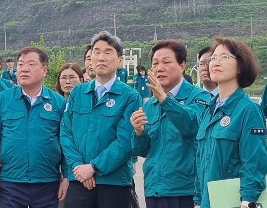 이주호 대통령 권한대행(왼쪽부터 두번째)이 최근 경남 산청군 시천면 산불피해 복구 현장을 방문해 박완수 경남지사(왼쪽부터 네번째)로부터 설명을 듣고 있다./경남도 제공/ |