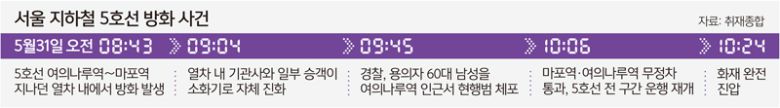 1일 경찰 등에 따르면 전날 오전 8시43분 서울 지하철 5호선 여의나루역에서 마포역으로 향하던 열차 객차에서 화재가 발생했다. 60대 남성 A씨가 인화성 물질을 뿌리고 라이터형 토치로 옷가지에 불을 붙이면서 시작된 화재였다. 당시 열차에는 주말 나들이에 나선 400여명의 승객이 타고 있었다.