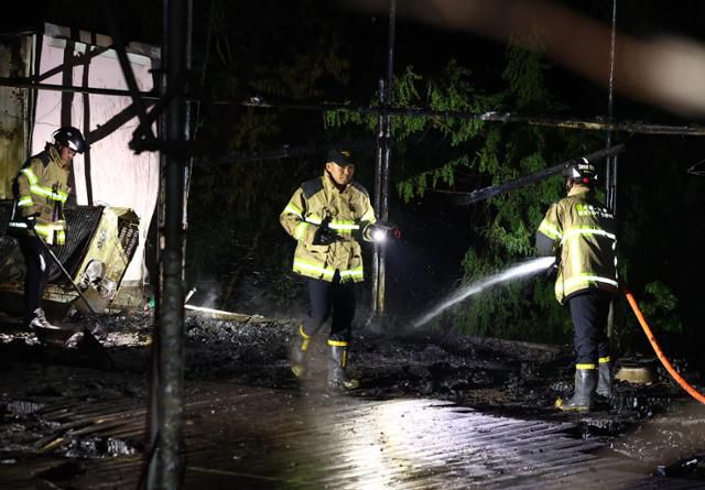 1일 밤 화재가 발생한 서울 노원구 수락산 인근 가건물에서 소방대원들이 큰 불길을 잡은 뒤 잔불을 정리하고 있다. 연합뉴스 |