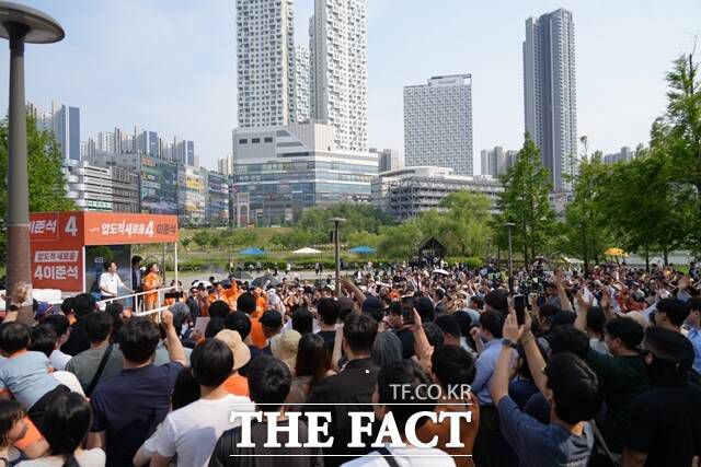 이곳은 이 후보가 지난해 총선에서 당선된 지역구다. 이날 유세 현장에는 수백 명의 인파가 몰려들어 이 후보에게 지지를 보냈다. 유세 현장에 도착한 뒤 유세차까지 이동하면서 시민들과 사진을 찍는 데 30분이 넘게 걸렸고, 연설 뒤에도 한 시간 가량 시민들과 포토타임을 가졌다.
