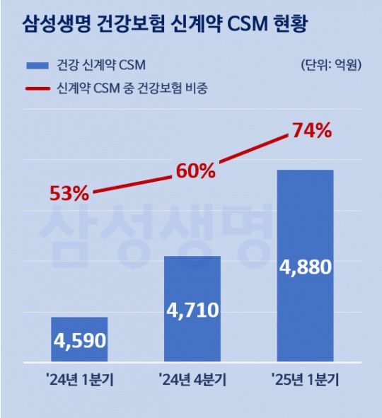 1일 보험업계에 따르면, 삼성생명은 올해 1분기 신계약 CSM에서 건강보험이 차지하는 비중이 2024년 1분기 53%에서 올해1분기는 74%로 확대됐다. 종신비중이 절반 이상이었던 FC(설계사) 건강보험 판매 비중도 2023년 건강보험 CSM 비중이 전체 보장성 상품 판매 중 2023년 45%에서 2024년 63%, 2025년에는 78%로 나타났다.