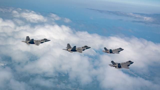 2024년 5월 16일 한미 공군이 사상 처음으로 실시한 5세대 전투기 간 기본전투기동 훈련에서 우리 공군의 F-35A 2기(오른쪽)와 미국 공군의 F-22 2기가 편대비행을 하고 있다. 공군 제공 |