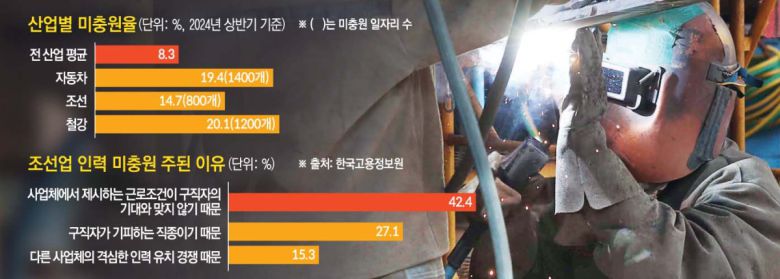 대표적인 현장이 조선업이다. 1일 조선·해양 인적자원개발위원회가 발표한 ‘2024 조선·해양산업 인력현황 보고서’에 따르면 지난해 상반기 조선 업종 미충원율은 14.7%에 달했다. 전 산업 평균 8.3%의 두 배 수준이다.