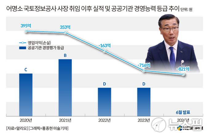 LX공사의 경영평가 결과가 2022년과 2023년 D등급이었지만 어 사장은 기관장 해임 건의 대상에 오르지 않았다. 지난 2023년 11월 취임해 평가연도 기준 재임기간 1년이 되지 않았기 때문이다. 지난해 경고 조치 대상에서도 제외됐다.