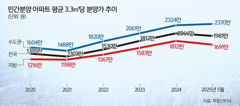 실제 부동산R114가 민간분양 아파트의 분양가 추이를 조사한 결과, 전국 평균 3.3㎡당 분양가는 2015년 988만원(세대 가중 평균, 기준층 기준)에서 지난해 2066만원으로 2배 넘게 상승했다. 올해 1∼5월까지의 평균 분양가는 1981만원으로 집계됐다.