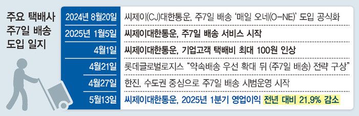 결국 한진택배는 지난달 27일부터 수도권과 일부 지방 주요 도시에서 주7일 배송 시범운영을 시작했으나 노동조합과 갈등을 빚고 있다. 롯데글로벌로지스는 물품을 원하는 시간대에 배송하는 ‘약속배송’을 2027년까지 전국으로 확대한 뒤에 주7일 배송 도입을 검토하기로 했다.