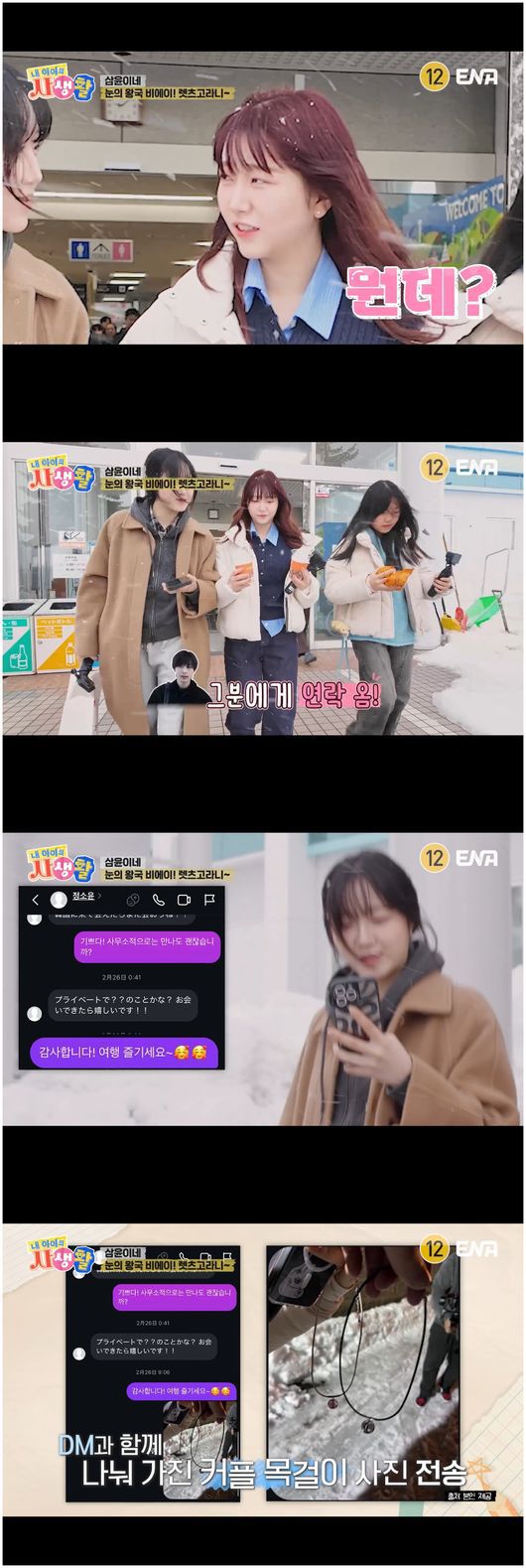 게다가 코우키는 DM을 그치지 않았다. 세윤은 “야야, 그분(코우키)에게 연락 옴. 여행 잘 즐기라고 한다”라며 소윤에게 전했다. 또한 코우키는 유리 공방에서 만든 커플 목걸이를 사진 찍어 보내기까지 했다. 소윤은 “조용히 해”라며 부끄러운 듯 웅얼거렸다.
