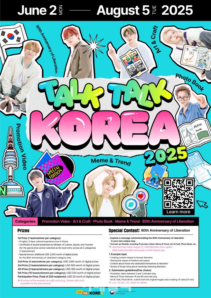 ‘토크토크코리아’는 올해로 12회를 맞이하는 한류 콘텐츠 공모전이다. 올해 공모는 2일부터 8월 5일까지 진행한다. 한국문화에 관심 있는 외국인이라면 누구나 공식 홈페이지를 통해 공모전에 참여할 수 있다. 공모 분야는 △프로모션 비디오 △아트&크래프트 △포토북 △밈&트렌드 △광복 80주년 기념 특별분야 등 총 5개 분야로 진행한다.