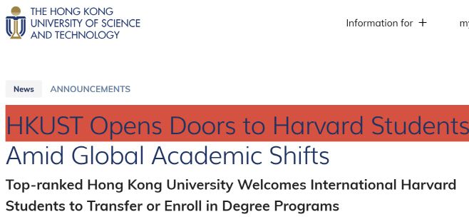 미국 국토안보부가 하버드대에 대해 학생 및 교환 방문자 프로그램(SEVP) 인증을 취소한다고 발표한 다음날인 5월 23일 홍콩과기대는 "(유학생들을) 조건 없이 받아들이겠다"며 편입 절차와 학생 생활 지원도 제공할 것이라고 발표했다. 우수한 학생들을 유치해 '다양성을 갖춘 세계적 수준의 학습 환경을 조성한다'는 취지다.