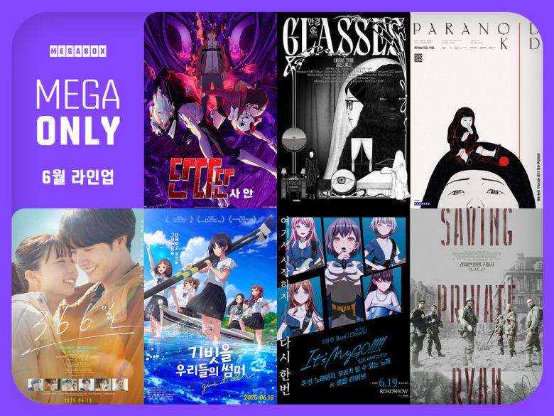 6월의 ‘메가 온리’ 단독 상영작은 ▲단다단: 사안 ▲366일 ▲파라노이드 키드 ▲안경 ▲기빗올: 우리들의 썸머 ▲극장판 뱅드림! 잇츠 마이고!!!!! 후편: 노래하자, 우리가 될 수 있는 노래 & 필름 라이브 ▲라이언 일병 구하기 총 7편이다.