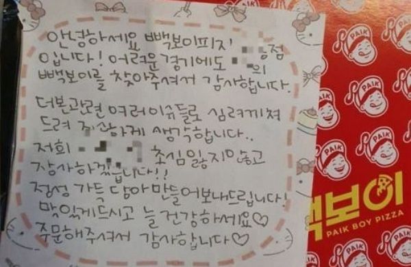 지난달 31일 한 온라인 커뮤니티에는 더본코리아 브랜드인 빽보이피자에서 피자를 주문했다고 밝힌 A 씨가 ‘점주로부터 받은 쪽지’라며 사진을 올렸다.