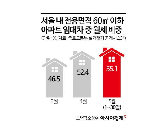 2일 국토교통부 실거래가 공개시스템에 따르면 지난달 1~30일 서울 내 전용면적 60㎡ 이하 소형 아파트 임대차 거래 중 월세 비중은 55.1%로 집계됐다. 4월 52.4%로 5.9%포인트 상승한 데 이어, 점차 월세 비중이 높아지고 있는 것으로 분석된다. 지난해 같은 기간과 비교하면 3월을 제외하고 올해 월세 비중이 더 높았다.