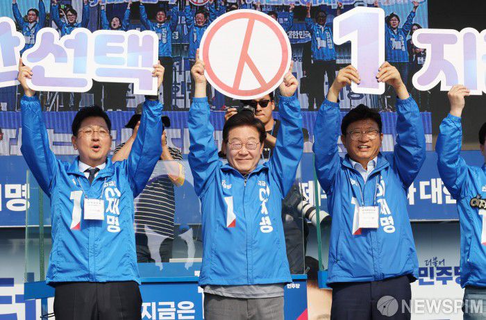 [울산=뉴스핌] 윤창빈 기자 = 더불어민주당 이재명 대선 후보가 막바지 '험지 공략'에 나선 1일 오후 울산 동구 일산해수욕장 앞에서 열린 유세에서 투표를 독려하는 퍼포먼스를 하고 있다. 2025.06.01 pangbin@newspim.com