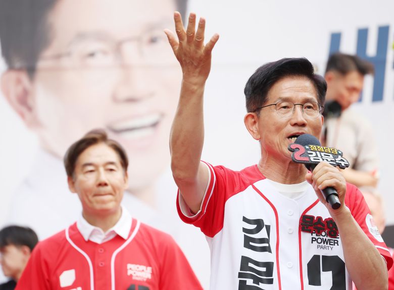 김문수 국민의힘 대통령 후보가 1일 오후 서울 서대문구 신촌역 앞 집중유세에서 시민들에게 지지를 호소하고 있다./뉴스1 |