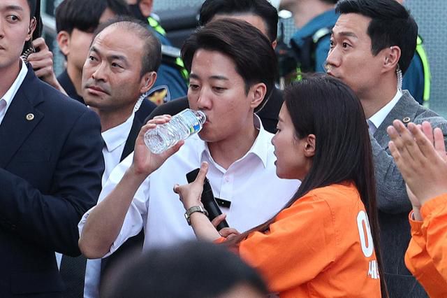 이준석(오른쪽 세 번째) 개혁신당 대선 후보가 1일 서울역 광장에서 열린 유세에 앞서 목을 축이고 있다. 뉴스1