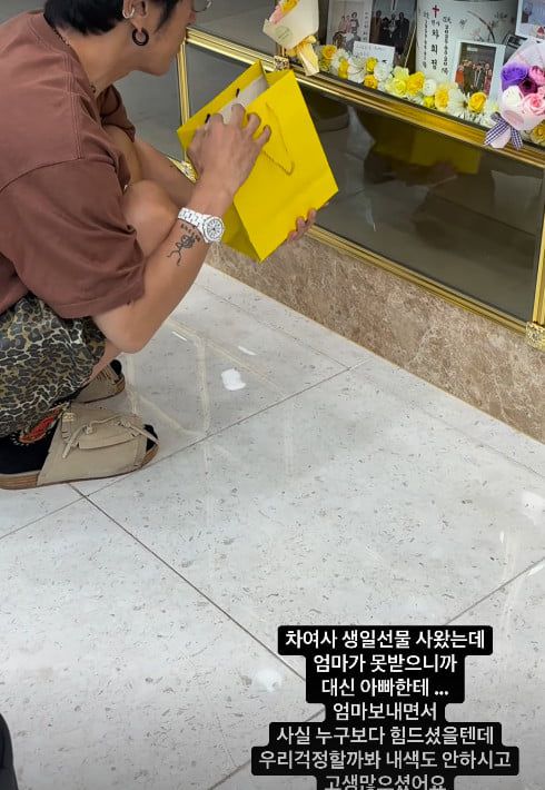 공개된 영상 속에는 빽가가 고인이 된 모친의 생일을 축하하기 위해 납골당을 찾은 모습. 하지만 빽가가 케이크와 선물을 들고 왔으나 모친은 최근 하늘나라로 떠난 상황. 이에 빽가는 아버지에게 명품 R사 시계를 선물했다.