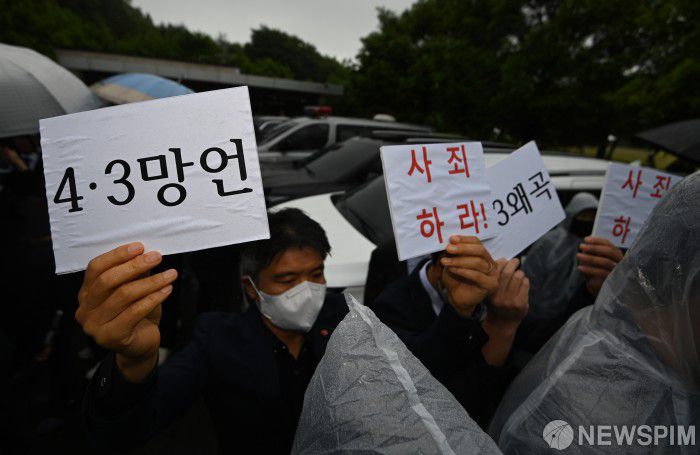 [제주=뉴스핌] 윤창빈 기자 = 제주4·3 유가족이 2일 오전 제주4·3평화공원에 참배를 하러온 김문수 국민의힘 대선후보의 과거 발언에 항의하고 있다. 2025.06.02 pangbin@newspim.com |