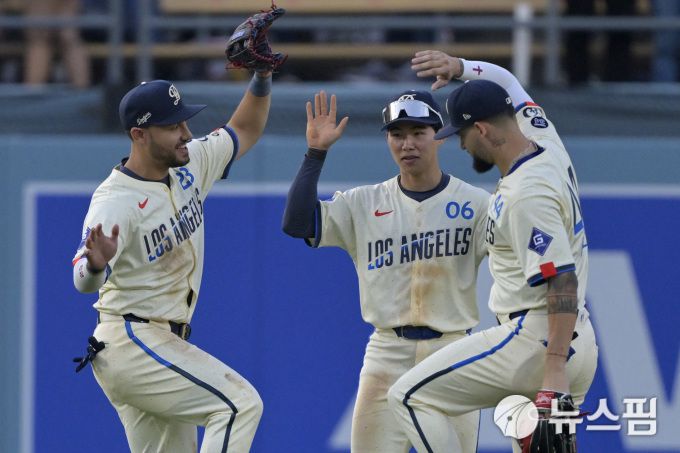 [로스앤젤레스 로이터=뉴스핌] 장환수 스포츠전문기자= LA 다저스 김혜성(가운데)이 1일 뉴욕 양키스와 홈경기에서 18-2로 대승을 거둔 뒤 동료들과 하이파이브를 하고 있다. 왼쪽부터 좌익수 마이클 콘포토, 김혜성, 우익수 앤디 파헤스. 2025.06.02 zangpabo@newspim.com