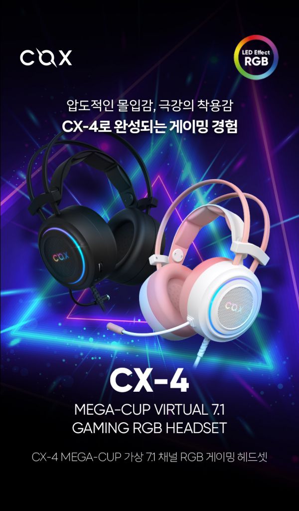 [디지털포스트(PC사랑)=남지율 기자] 삶의 새로운 패러다임, '뉴 라이프 플랫폼'을 만들어가는 주식회사 앱코(대표이사: 오광근)의 게이밍 기어 브랜드 콕스(COX)가 'CX-4 MEGA-CUP 가상 7.1 채널 RGB 게이밍 헤드셋(이하: CX-4)'을 출시했다.