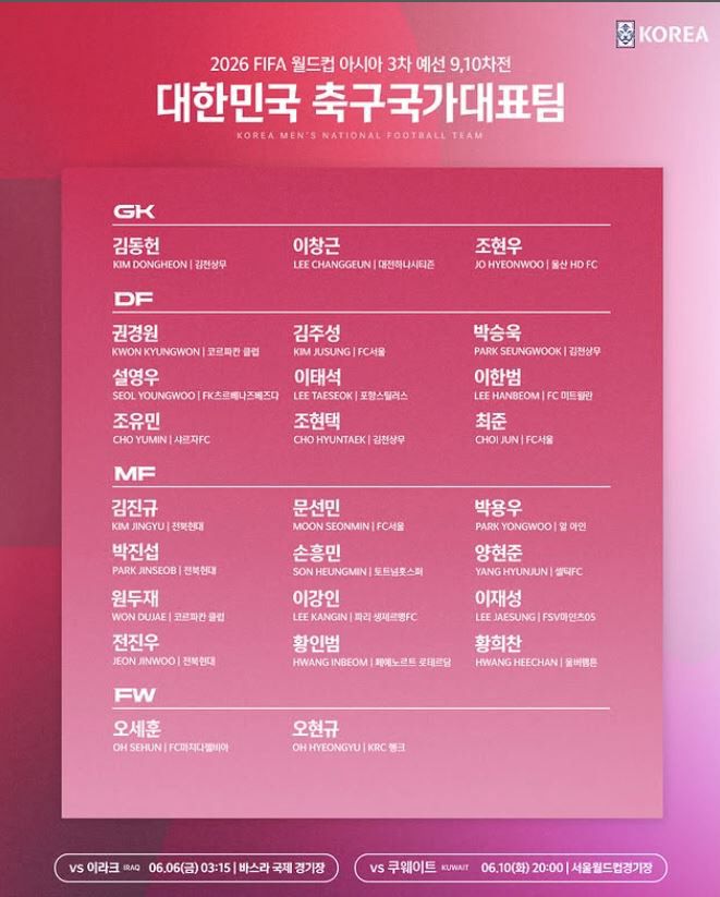 한국은 B조 8경기에서 4승4무(승점 16점) 무패 1위를 달리고 있다. 요르단(승점 13), 이라크(승점 12)가 2-3위로 뒤따르는 상황, 이라크 원정에서 비기기만 해도 11회 연속 월드컵 본선행을 확정한다. 이라크전에서 결정짓지 못할 경우 안방 쿠웨이트전이 남아 있다. 6월 2경기에서 승점 1점이 필요하다. '화룡점정'을 찍어야할 중요한 일전인 만큼 고질적인 부상에 시달리고 있는 센터백 김민재(바이에른 뮌헨) 외에 '유로파 우승 캡틴' 손흥민(토트넘)을 비롯해 '챔스 우승 에이스' 이강인(파리생제르맹)을 비롯해 이재성(마인츠), 황희찬(울버햄턴), 황인범(페예노르트), 양현준(셀틱), 설영우(츠르베나 즈베즈다), 오현규(헹크) 등 해외파들이 총출동한다.