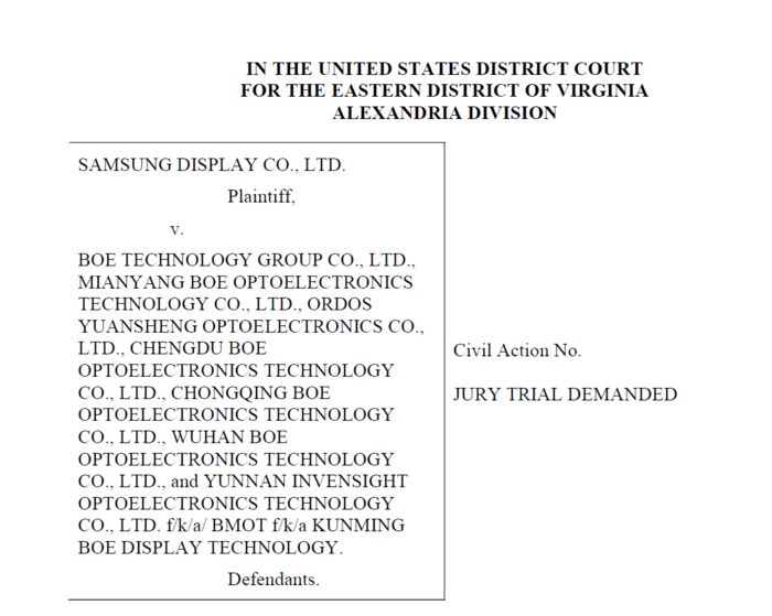삼성디스플레이는 지난달 28일(현지시간) 미국 버지니아 법원에 특허 침해로 BOE과 BOE 관계사들을 제소했다. 유기발광다이오드(OLED) 특허 5건을 침해했다는 게 골자다.