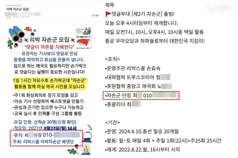 같은 카페에 2022년 8월 '2기 자손군'을 출범한다며 올린 모집글에도 단장 최 씨의 전화번호가 있다. 2기 자손군 운영 기간은 2024년 4월 10일 총선 때까지 20개월 동안이었다. 이들이 지난 22대 총선 때도 댓글부대로 활동하며 국민의힘을 지지하고 더불어민주당 등 야당을 비난하는 댓글을 달았을 가능성이 제기되는 대목이다.