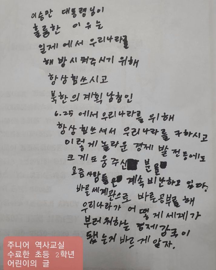 해당 글을 보면 리박스쿨의 주니어 역사교실을 수료한 한 초등학교 2학년생은 “이승만 대통령님이 훌륭한 이유는”이라고 말 문을 열었다. 이어 “일제에서 우리나라를 해방시켜 주시기 위해 항상 힘쓰시고 북한의 계획 남침인 6·25 전쟁에서 우리나라를 위해 항상 힘쓰셔서 우리나라를 구하시고”라고 썼다.