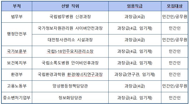 민간의 경험과 전문성을 적극 활용할 수 있는 분야를 중심으로 각 부처가 지정해 민간 전문가만 지원할 수 있는 경력개방형 직위는 ▲행안부 국가정보자원관리원 사이버안전과장 ▲보훈부 국립5.18민주묘지관리소장 ▲복지부 국립소록도병원 안이비인후과장 ▲환경부 국립환경과학원 환경에너지연구과장 ▲중기부 정보화담당관 등 5개다.