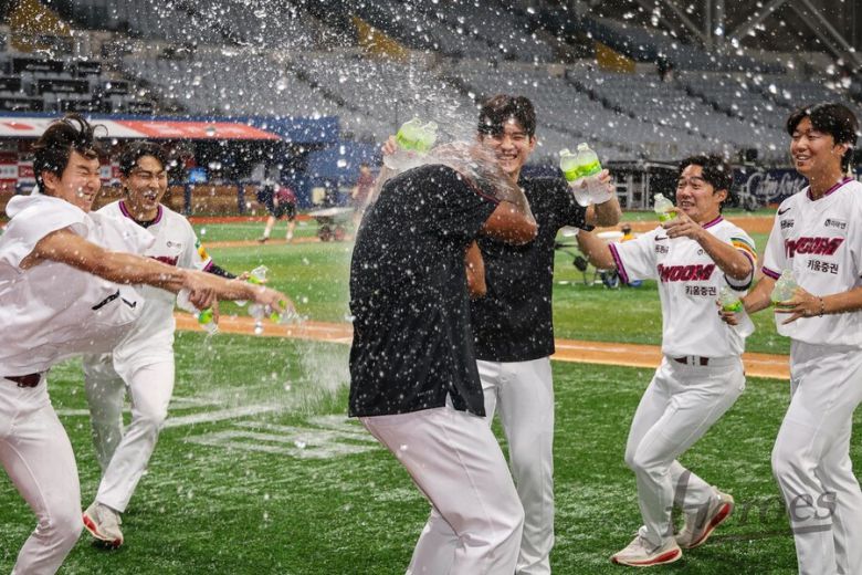 키움 선발 투수 라울 알칸타라(가운데)가 1일 서울 고척스카이돔에서 열린 2025 KBO리그 두산 베어스와 경기에서 선발승을 챙기자, 동료들로부터 축하를 받고 있다. 키움 히어로즈 제공