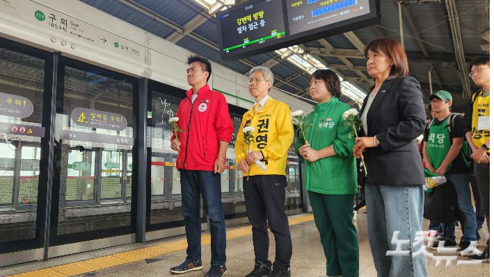 그는 "2016년 5월에 구의역에서 김 군이 컵라면을 가방에 둔 채 사망했던 사실을 기억하실 것"이라며 "더 이상 일하다 죽지 않는 사회, 안전한 일터를 만들겠다는 각오로 구의역에 왔다"고 강조한 뒤 9년 전 김 군이 사망한 자리에 국화를 바쳤다.