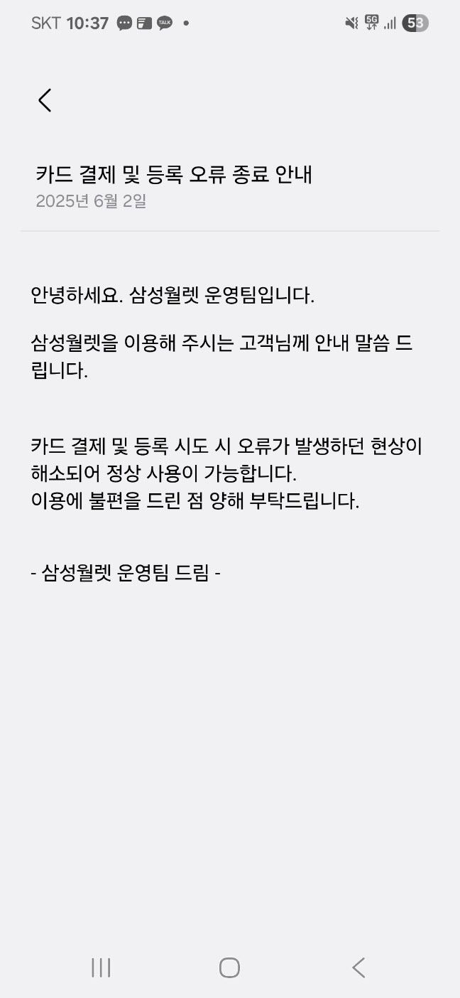 문제가 발생한 플랫폼은 삼성페이가 포함된 ‘삼성월렛’이었으며, 이용 통신사와는 무관하게 광범위한 피해가 발생했다.