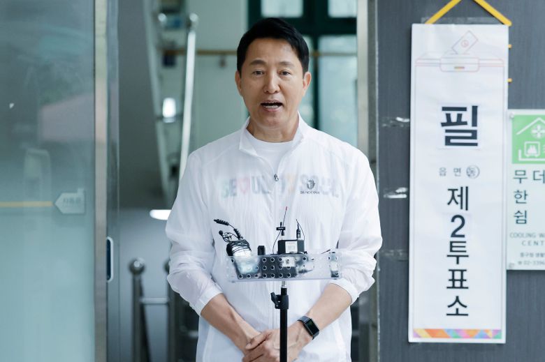 (서울=뉴스1) 신웅수 기자 = 오세훈 서울시장이 2일 서울 중구 구립 필동 경로당에 마련된 제21대 대통령선거 투표소를 방문해 이동약자 투표 편의시설 점검을 마치고 대시민 메시지를 발표하고 있다. (공동취재) 2025.6.1/뉴스1 |