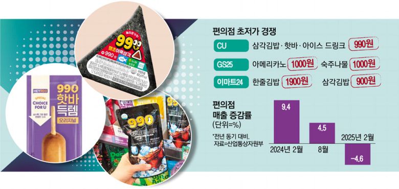 이마트24도 올해 1월부터 초저가 제품에 더욱 힘을 주고 있다. 일반 한줄김밥보다 45%가량 저렴한 1900원짜리 김밥을 비롯해, 900원짜리 삼각김밥도 올 들어 새롭게 출시했다. 세븐일레븐도 최저 1990원짜리 채소 등 저가 제품 확대에 힘을 쏟고 있다. 지난 1월에는 업계 최저가인 800원 아메리카노를 출시하기도 했다.
