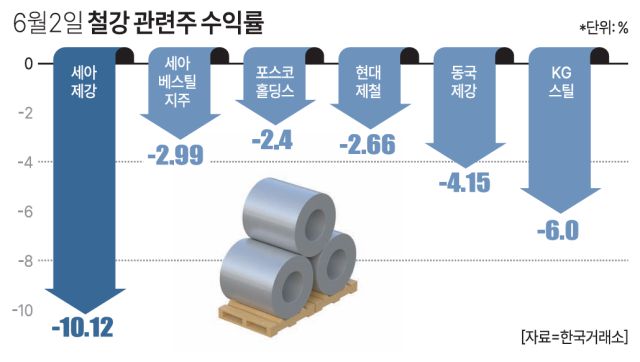 이번 하락은 트럼프 대통령이 지난달 30일(현지시간) 철강 제품에 대한 수입 관세를 기존 25%에서 50%로 인상하겠다고 밝힌 데 따른 반응으로 풀이된다. 인상된 관세는 4일부터 적용될 예정이다.