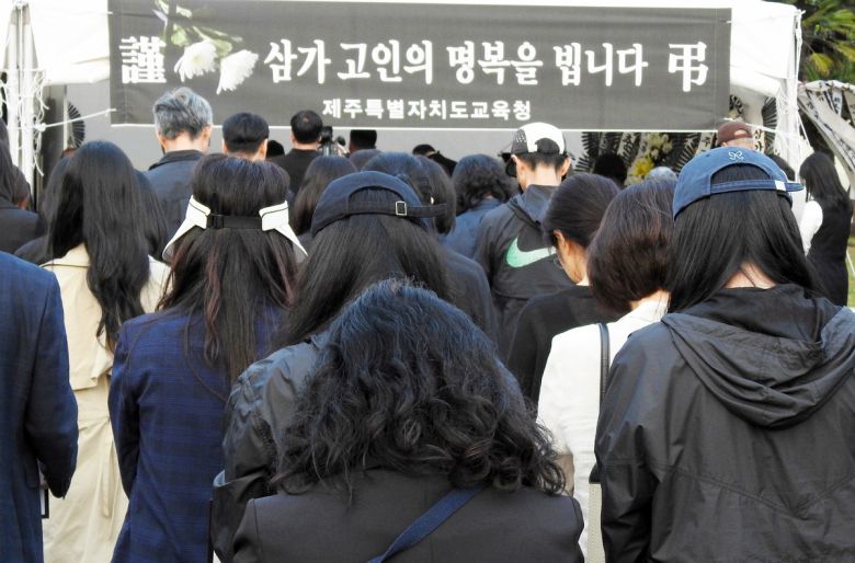 지난 5월 30일 제주도교육청 주차장에서 열린 교사 추모제에서 참가자들이 분향소를 향해 인사하고 있다. 고인은 숨지기 전 학생 가족의 민원에 시달렸던 것으로 전해졌다. 뉴시스