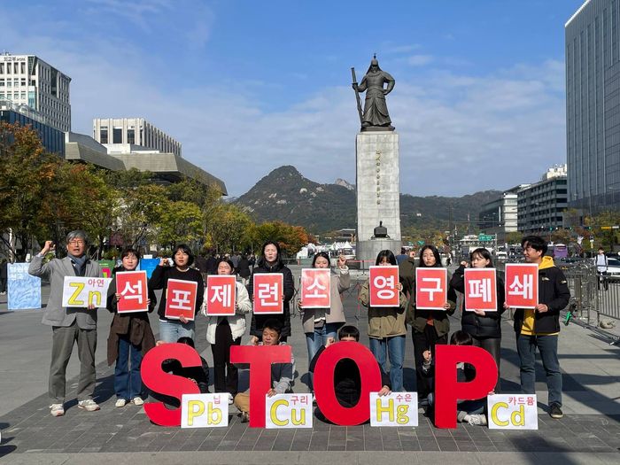 환경운동연합과 환경보건시민센터 등 회원들이 지난해 11월 5일 서울 종로구 광화문 광장에서 영풍 석포제련소 폐쇄 촉구 기자회견을 하고 있다.