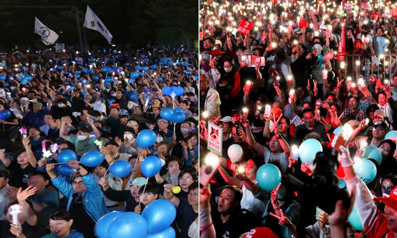파란 물결 對 빨간 물결… 마지막 유세 더불어민주당 이재명 대선후보 지지자들이 2일 오후 서울 여의도공원 문화의마당에서 열린 이 후보의 마지막 유세에서 응원봉과 풍선을 흔들며 환호하고 있다. 허정호 선임기자