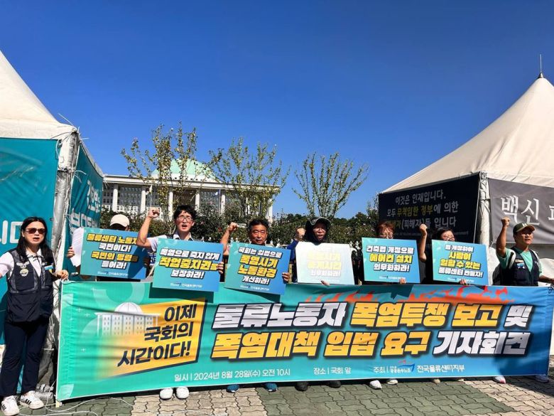 공공운수노조 전국물류센터지부 조합원들이 지난해 8월28일 국회 앞에서 열린 ‘물류노동자 폭염투쟁 보고 및 폭염대책 입법 요구 기자회견’에서 구호를 외치고 있다. 연합뉴스
