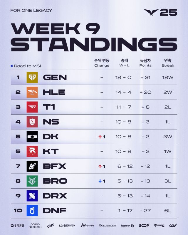 리그 오브 레전드 챔피언스 코리아(이하 LCK)는 젠지가 지난달 28일부터 6월1일까지 서울시 종로구 롤파크에 위치한 LCK 아레나에서 열린 2025 LCK 정규 시즌 9주차 경기에서 모두 승리하면서 18전 전승으로 마무리했다고 2일 밝혔다.