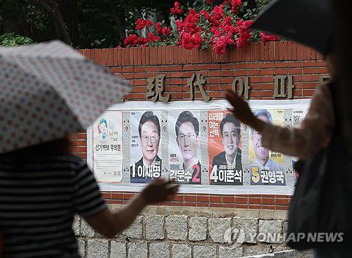 (서울=연합뉴스) 김성민 기자 = 제21대 대통령선거를 하루 앞둔 2일 서울 한 아파트 장미 화단 아래에 대선후보 벽보가 붙어 있다. 2025.6.2 ksm7976@yna.co.kr