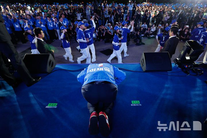 [서울=뉴시스] 김지은 김경록 기자 = 이재명 더불어민주당 대선후보는 공식 선거운동 마지막 날인 2일 서울 여의도광장에서 피날레 유세를 펼쳤다. 이 후보는 "빛의 혁명이 시작됐던 이곳에서 내란을 종식하자"며 막판 지지를 호소했다. 연설 후에는 애국가를 부르며 국기에 경례하고, 유권자들을 향해 큰절도 했다.